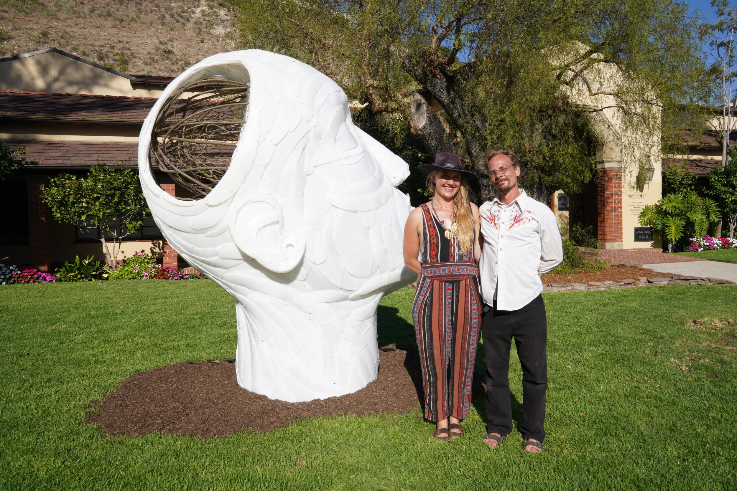 The sculpture consists of a steel frame, skinned with reclaimed 55 gallon barrel plastics (a macro single use item), representing how disembodied we have been through modern development and the creation of the plastic problem. It illustrates how both our bodies and behaviors have been besieged. In the head, there is a hole where the brain should be, further punctuating the mindlessness of this problem. However, the hole is filled with natural materials and the surrounding landscape, reminding us that nature will teach us how to solve the problem if we quiet our minds enough and listen.